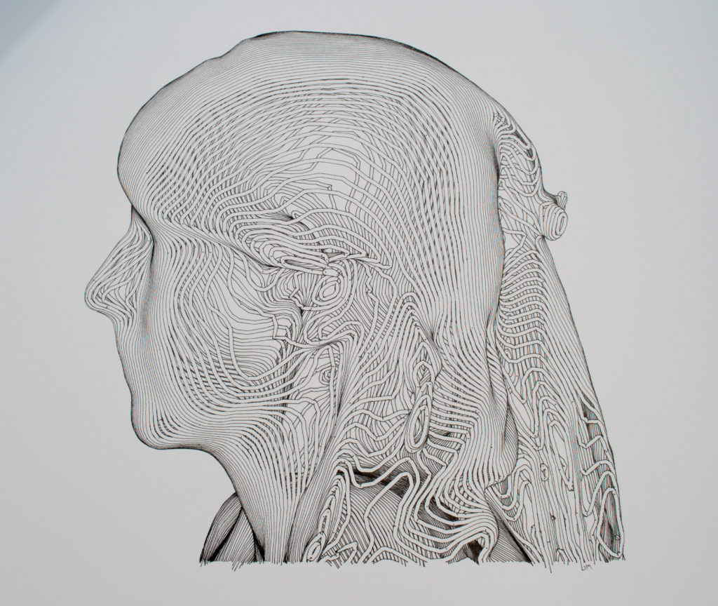 Portrait of the sister. Posted on May 22, 2020 1 min read Portrait of the sister. 3D scanned, layered, ribboned, and plotted. #plotterTwitter #axidraw #blender